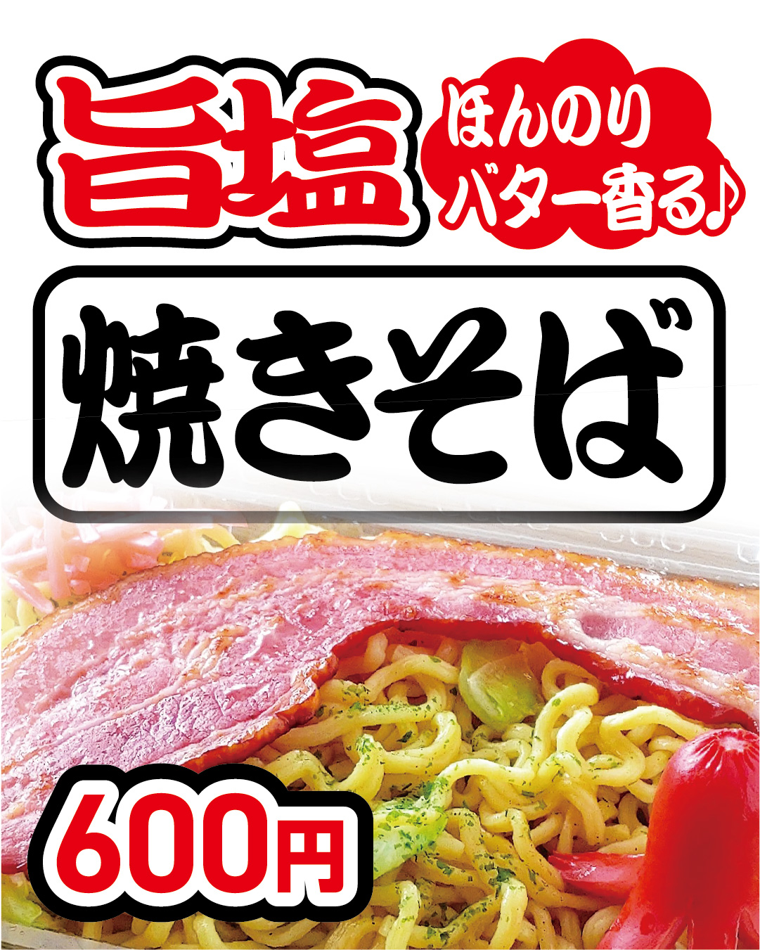 屋台では珍しい塩焼きそばを販売しております。ほんのりバター風味でお子様にも大好評!