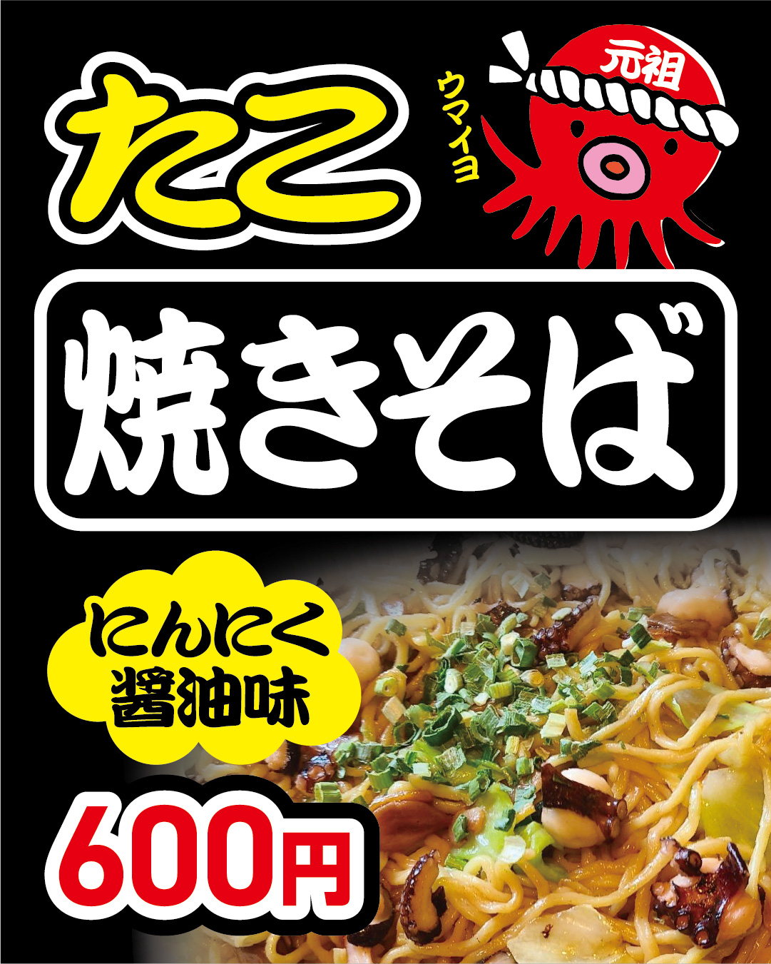 にんにく醤油味の焼きそばにプリプリのタコをふんだんに加えた店主イチオシのたこ焼きそば!